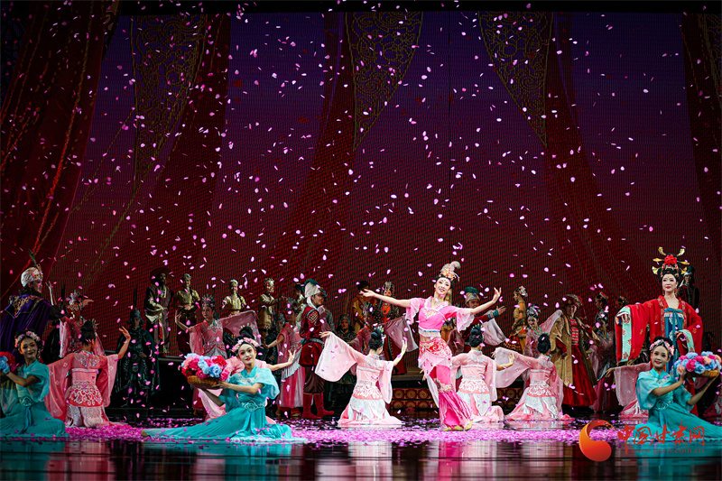 當(dāng)全息投影將莫高窟壁畫(huà)在舞臺(tái)上緩緩展開(kāi),當(dāng)駝鈴聲與電子樂(lè)編曲交織出跨越時(shí)空的和弦,觀眾相信,所謂“傳統(tǒng)”從不是凝固的標(biāo)本,而是流動(dòng)的生命,正如劇中穿越千年的花雨,落在古代畫(huà)工的筆端,落在當(dāng)代舞者的袖間,浸潤(rùn)海內(nèi)外每一位觀演者的心田。劇中描繪的中外友好通商、民心交融場(chǎng)景,更是對(duì)新時(shí)代“一帶一路”倡議的生動(dòng)詮釋。(甘肅省文化旅游廳供圖)