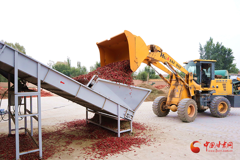 在臨澤景誠農(nóng)業(yè)發(fā)展有限公司的辣椒加工廠內(nèi),記者看到晾曬場上的辣椒鋪成“火紅”一片;廠房里,辣椒色選機、剪把機高速運轉(zhuǎn),工人們分工協(xié)作,加工現(xiàn)場繁忙而有序。